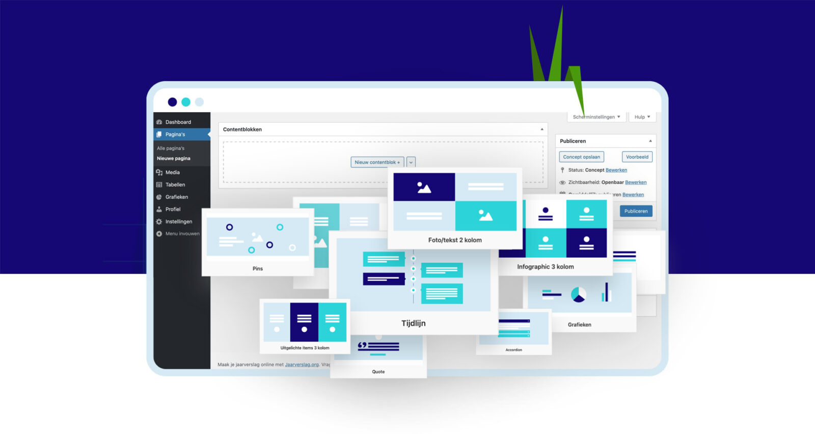 Onder het tabblad ‘pagina’s’ worden al je pagina’s verzameld en ingericht. Je vult deze pagina’s aan de hand van contentblokken. Maak je bijvoorbeeld een grafiek of tabel (via de andere tabbladen), dan voeg je deze in je publicatie via een pagina (aan de hand van contentblokken). Zodra je klaar bent met een pagina kun je deze aan je publicatie toevoegen via het tabblad ‘instellingen’ > ‘pagina indeling’.