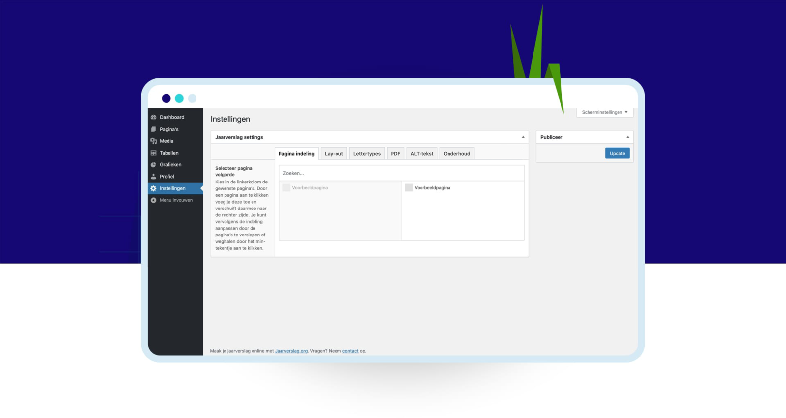 Kies je gewenste layout en richt je basisinstelling in: Onder het tabblad ‘Instellingen’ beheer je al je algemene instellingen voor je publicatie. Zoals pagina’s indelen, huisstijl voorkeuren (zoals je logo, kleuren, lettertypes), uitgebreide layout opties en een pdf maken. Met een paar klikken heb je je publicatie helemaal afgestemd op jouw huisstijl en in de door jou gewenste layout.