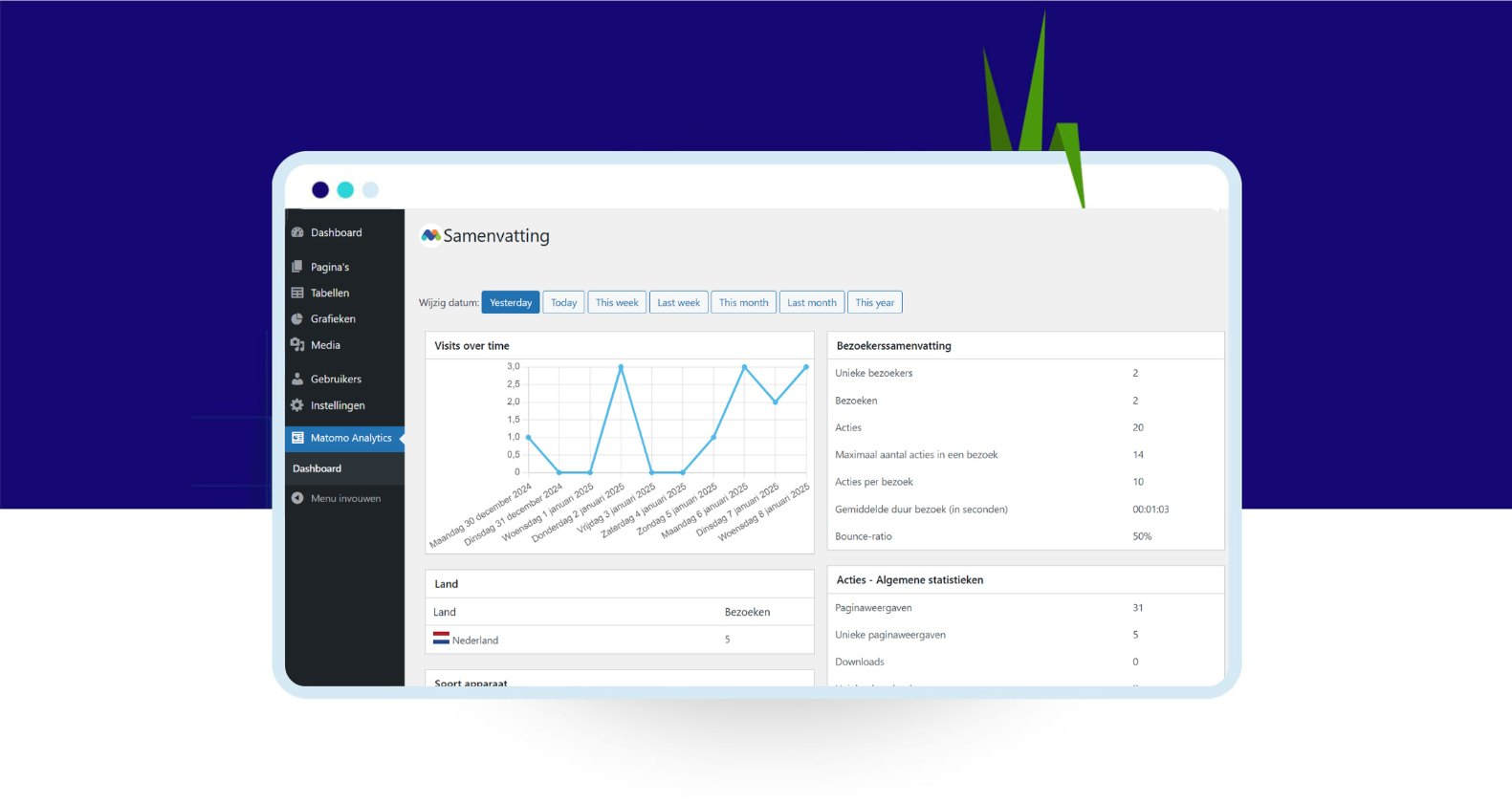 - Meten is weten! Wil je het bezoekersgedrag in je publicatie analyseren? Ga naar dashboard > Matomo Analytics en volg je bezoekers.